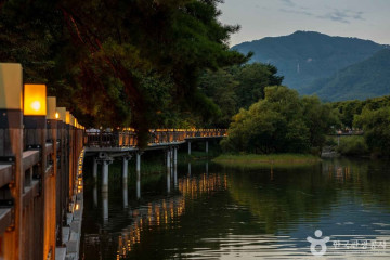 - 용추폭포 위에 설치한 유리전망대는 인도교로 바닥 부분에 투명 유리와 불투명 유리가 섞여 있는데, 철제 기둥에 설치된 센서를 지나면 불투명 유리가 투명 유리로 바뀌어 폭포가 내려다 보인다. 발아래 쏟아지는 시원한 물을 지켜보며 걸을 수 있어 마치 폭포 위를 산책하는 듯한 아찔함과 시원스레 쏟아지는 물을 바라보며 스트레스를 해소할 수 있는 곳이다. 폭포는 아래에서 바라보는 경우가 일반적이라, 발아래 떨어지는 물줄기를 보는 느낌이 색다르다. 특히, 계절마다