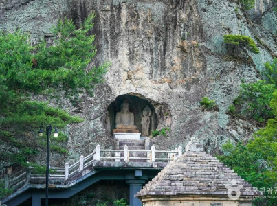 군위 부계면 남산리에는 신라 소지왕 15년 극달화상이 창건한 삼존석굴이 있다. 국보로 지정된 삼존석굴은 깎아지른 듯한 절벽의 자연동굴에 아미타불과 대세지보살, 관음보살이 온화한 자태를 드러내고 있다. 1960년대 말까지 세인들의 눈에 띄지 않았다가 1970년대 초 학자들에 의해 경주석굴암 보다 1세기 이상 일찍 창건된 것으로 그 모태임이 밝혀져 문화유산으로서의 가치성을 인정받았다. 신라 소지왕 15년(493)에 극단 화상이 창건했으며 석굴은 바닥은 평면이고, 네모 반듯한 형상으로 천장은 한가운데가 제일 높고 사방 주위는 차차 낮아지는 하늘 형상이다. 석굴 내에는 본존불인 아미타불과 좌우로 대제지보살, 관음보살이 있고 본존불의 결가보좌한 모습과 깎은 머리, 얼굴 모습은 풍만하며 거대하고 엄숙한 기품이 있다. 양쪽 귀는 길고, 목은 알맞게 바르게 한 선으로 뻗어 있으며 법의를 걸친 어깨 모습은 섬세하고 우아하다. 어깨는 벌어져 장대한 체구이고, 법의는 간단하면서도 예스러운 무늬로 넓은 무릎을 걸쳐 받침 자리 전면을 덮었다. 고구려에서 전해진 신라불교가 팔공산 자락에서 꽃 피워지고 신라 왕도 경주로 전해져 결실을 맺었다. 팔공산 비로봉에서 뻗어 내려온 산줄기는 이곳에서 거대한 바위산 절벽을 이루었고, 이 절벽 허리 20m 높이에 남으로 향한 둥근 천연동굴에 삼존불상을 봉안하였으니 섬존석굴이라 한다.