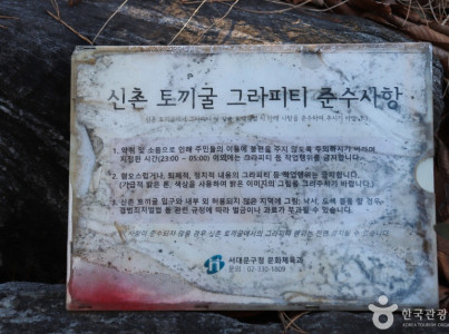 경의 중앙선 신촌역 1번 출구에 있는 신촌그래피티벽화터널은 일명 신촌토끼굴로 이 토끼굴은 도로가 개통되기 전 신촌과 이대후문, 연세대를 잇는 중요한 역할을 하던 굴다리였다. 하지만 토끼굴 옆에 도로와 지하도가 개통되면서 자연스레 사람들의 왕래가 줄어들며 어둡고 환경이 좋지 않았다. 그러나 이곳이 유명드라마 촬영지(도깨비)로 알려지면서 사람들이 찾기 시작하며 변신을 시도했다. 토끼굴 내부에 LED 조명등을 설치하고 목재 계단 진입로를 설치해 쾌적하고 안전한 보행로로 바뀌었다. 여기에 더해 길이 65m, 폭 4.5m의 공간 안에 각양각색의 그래피티를 터널 내부와 외부에 가득 그렸으며 LED 조명도 켜져 화려함을 더했다. 그래피티 작업하는 시간과 그림의 주제를 지키면 이곳에는 누구나 그래피티 작업을 할 수 있으며 따라서 그림은 수시로 바뀐다.
