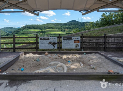 공룡 발자국 지층은 약 1억 년 전 중생대 백악기의 퇴적암으로 구성되어 있다. 2003년 태풍으로 산사태가 일어나면서 발자국이 있는 면이 노출되었고, 2004년 이상원(당시 포항 대흥초등학교장) 씨에 의해 발견되었다. 총 400여 개의 발자국 중 용각류가 3개에 보행열이 120여 개, 수각류가 9개에 보행열이 135개, 조각류가 나머지를 차지한다. 이곳에 살았던 용각류 공룡은 나무나 풀을 먹으며 네 발로 걸어 다녔던 초식 동물로 몸집이 크고 목이 길었고, 수각류 공룡은 다른 공룡이나 곤충 등을 잡아먹었던 육식동물로 날카로운 이빨과 발톱을 가졌다. (출처 : 청송 국가지질공원)