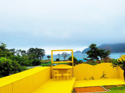 바람의핫도그 본점 뒷편에 위치한 노랑버덩은 사장님께서 거제 여행객들에게 소소한 여행의 즐거움을 찾을 수 있길 바라는 마음으로 손수 가꾼 정원이다. 노랑버덩이라는 명칭답게 입구부터 노란색의 향연이 펼쳐진다. 의자와 울타리, 바위 모두가 노란색으로 되어 있으며 곳곳에 다양한 포토존이 마련되어 있다. 또한, 수국이 피어나는 시기에는 수국 포토존 떠오르고 있다.