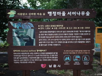 서어나무는 줄기가 튼튼해 근육질 나무라고도 불린다. 남원시 운봉읍 행정리에 있는 서어나무 숲은 약 100여 그루의 나무가 모여 울창한 숲을 이루고 있다. 이 숲은 연중 15℃ 안팎의 시원한 온도를 유지해 여름철에도 냉방기처럼 쾌적한 환경을 제공한다. 지리산 운봉 자락에 자리해 주변 풍광이 아름다우며, 자연경관을 감상하며 더위를 식히기에 적합하다. 행정마을은 지리산 둘레길 1코스와 바래봉 둘레길의 출발지로, 최근 많은 관광객이 찾고 있는 장소이다.