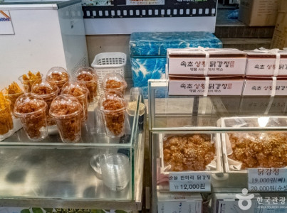 속초의 닭전골목은 속초 중앙시장 내에 있는 먹거리 골목으로, 대표적인 먹거리로는 닭강정, 튀김, 오징어순대 등이 있으며, 최근에는 돌돌말이 삼겹살도 등장했다. 각각의 가게마다 튀기는 방법과 재료가 조금씩 달라 고유의 맛을 느낄 수 있다. 특히 다양한 닭강정 가게들이 모여있어 닭강정 특화 거리라 해도 과언이 아니다. 닭강정은 G20정상회의가 열렸을 때 세계 각국 귀빈들에게 대접해서 국민 간식이 됐을 만큼 역사는 오래되지 않았지만 독특한 조리법과 달콤한 맛으로 한식의 한 부분을 차지하고 있다. 닭강정 하면 속초가 떠오를 만큼 속초의 특화 골목으로 자리매김하고 있다. 한동안 서울의 유명백화점에 입점하기도 했다. 속초 닭강정은 실내에서 먹을 수 없고 포장만 가능한 곳이다. 유명세만큼 전국 어디서나 택배로 받아볼 수 있다. 주차는 속초 관광 수산 시장 대형주차장을 이용할 수 있다.