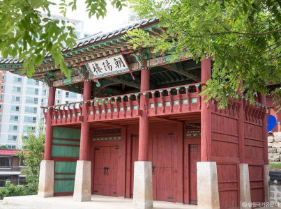 조양루는 강원특별자치도 춘천시 중앙로 1가, 강원특별자치도청 앞에 위치한 건축물로, 강원특별자치도의 유형문화유산로 지정되어 있다. 1646년 춘천지사 엄황이 관아 건물인 문소각을 신축할 때 위봉문과 함께 건립되었다. 조선 고종은 유사시 춘천을 피란처로 삼고 이궁 설치를 명하였으며, 이에 따라 초대 춘천유수 김기석이 공사를 시작하였다. 1890년 2대 유수 민두호가 문소각과 부속 시설을 확장하며 이궁을 완성하였다. 조양루는 이궁 내에서 임금의 침전이자 집무소였던 문소각의 문루로 사용되었다. 일제강점기와 전란을 거치며 춘천 이궁 대부분이 소실되었고, 현재는 조양루와 위봉문만이 남아 있다. 1908년 우두산으로 이전되었고, 한국전쟁 중 일부가 파손된 후 1969년 보수되었으며, 2013년에 현 위치로 복원되었다. 조양루는 관아건물의 전형적인 양식을 보여주는 동시에, 춘천 이궁의 유일한 잔존 건물로서 역사적 의의가 크다. 현판은 조선 후기 명필 자하 신위가 쓴 해서천자문의 글씨를 집자하여 복각한 것이다. 건물은 정면 3칸, 측면 2칸의 팔작지붕 구조로, 누각 아래에 삼문이 설치된 문루 형식을 띠고 있다.