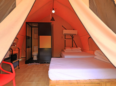 설악 나들목에서 청평댐 쪽으로 가다가 만나는 솔고개 아래쪽, 즉 솔고개 휴게소에서 내리막길을 내려가면 왼쪽으로 간판이 보인다. 글램핑 텐트 19동과 카라반 객실 15동, 한옥 펜션으로 구성된 새연리조트에는 초대형 수영장과 카라반 사이트를 한 바퀴 도는 공중 레일바이크가 있어 재미를 더한다. 캠핑장은 아래위 두 단으로 구성되어 있는데, 길 쪽 높은 곳에 카라반 사이트가 아래쪽 계곡 옆으로 글램핑텐트가 배치되어 있다. 카라반은 인원에 따라 다양하게 이용할 수 있도록 3가지의 크기가 있고, 글램핑은 내부가 넓은 카바나 텐트이다. 또한 카라반과 글램핑 모든 객실마다 데크가 딸려 있다.