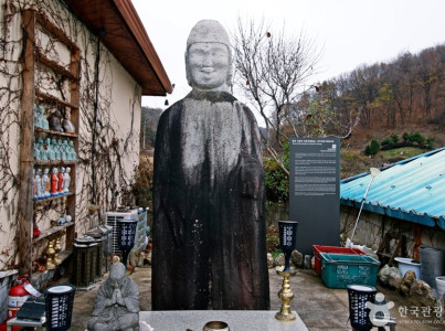 충주시 앙성면에 있는 원불사 경내에 봉안된 석불 입상이다. 마을 앞 과수원 근처의 민가 같은 곳에 모셔두었다. 원래의 위치는 확실치 않지만 마을에 불당, 미륵당, 산제당 등 3당이 있어 삼당리라 부르는 것으로 보아 근처의 절터에서 옮겨온 것으로 보인다. 원래는 머리에 비나 눈, 먼지 따위를 막아주는 보개를 쓰고 있었으나 보개는 불상에서 분리해 놓은 상태이다. 머리는 소발에 육계는 표현되지 않았으며 얼굴은 풍만상이다. 입술은 두꺼우며 눈은 마멸이 심해 잘 알 수 없으나 일직선으로 보인다. 양손은 손바닥을 바깥으로 향하여 밑으로 내렸는데 왼손은 약지와 소지를 구부리고 있다. 목 부분은 보수되었는데 삼도가 확인되며 배면에는 특별한 장식이 없다. 조선 시대에 조성된 불상으로는 보기 드물게 2m가 넘는 대형의 석불로, 정형적인 모습에서 퇴보하거나 형식화되어 자비와 엄숙함보다는 다소 친근함을 느끼게 하는 모습으로 당시 지방 불상 양식의 일면을 알아볼 수 있는 석불이다. 조각 수법은 전체적으로 서툴고 정교하지 않다. 마을에서는 예로부터 이 불상에 기도하면 아들을 낳는다는 얘기가 전해진다.