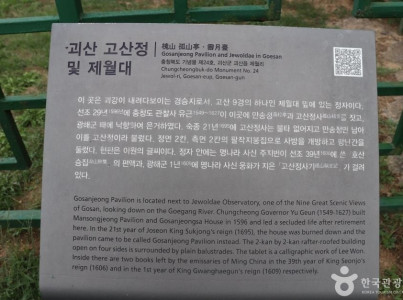 괴산읍에서 수안보로 가는 19번 국도를 따라 4㎞쯤 가면 속리산에서 발원해 남한강의 상류와 합쳐지는 달천 양측 기슭에 있는 9개의 명승지이다. 고산은 넓은 들판 가운데 솟은 산으로 달천이 태극 모양으로 감싸며 흐르고 있다. 고산정에 올라 사방을 둘러보면 멀리는 속리산에서 발원한 푸른 물이 정자 밑을 돌아 흐르고 남으로는 작은 봉우리들이 마치 말을 탄 수천의 군사가 진을 친 듯하다. 조선 선조 때 충청도 관찰사로 온 유근이 이곳에 만송정과 고산정사를 지은 뒤, 광해군 때 혼탁한 정치를 피해 이곳에 은거할 무렵 고산 9경을 정하였다고 한다. 제1경은 만송정, 제2경은 황니판, 제3경은 관어대, 제4경은 은병암, 제5경은 제월대, 제6경은 창벽, 제7경은 영객령, 제8경은 영화담, 제9경은 고산정사이다. 제1경 고산정은 조선 선조 때의 명현 서경 유근이 충청 관찰사로 있을 때인 1596년에 창건하였으며 만송정이라 하였다. 광해군 때 어지러운 정치를 피해 고향에 돌아와 이곳에 머물면서 고산정이라 개칭하였다. 선조 때 명나라 학자 주지번이 썼다는 ‘은병’ 두 글자가 새겨져 있다. 1978년 10월 27일 충청북도 기념물로 지정되었다. 제3경 관어대는 영화담 위에 있으며 바위 절벽 아래서 내려다보면 한가롭게 놀고 있는 물고기들의 모습을 볼 수 있다. 세속을 떠난 신선처럼 마음의 평화를 찾을 수 있는 곳이다. 제4경 은병암은 제월대에서 강을 따라 조금 내려가면 푸른 강물이 S자로 크게 굽이치는 절벽과 절벽에 연이은 큰 바위들이 강물에 반쯤 드리워져 있어 절경을 이루고 있는데 이 바위를 은병암이라 한다. 제5경 제월대는 고산정이 있는 부분의 절벽 부분을 지칭하는 것으로 일반적으로 강줄기 양편에 흩어진 일련의 경승지를 통칭한다. 제8경 영화담은 고산정 아래로 속리산으로부터 흐르는 푸른 물이 여울 소리를 내며 유유히 흘러와 정자 밑에서 머물러 못을 이루는 곳이다. 푸른 연못처럼 평온하고 많은 물고기들이 노닐고 있어 한 폭의 동양화를 연상시킨다. 봄에 진달래꽃이 피면 꽃 그림자가 물에 비쳐서 산 그림을 펼쳐 놓은 것처럼 아름다우며 봄부터 가을까지 관광객들의 발길이 끊이지 않는다. 제9경 고산정사는 고산정에 걸려 있는 고산정이란 글을 말하며 숙종 때 편찬된 『괴산군읍지』에 의하면 1695년(숙종 21)에 화재로 소실되었다고 한다. 주변에 충민사, 속리산국립공원, 쌍곡계곡, 괴강유원지, 각연사, 괴산호, 선유동구곡, 화양구곡, 미선나무자생지, 조령산자연휴양림, 공림사, 갈론계곡, 수옥정관광지 등 문화유적지와 관광지가 많다.
