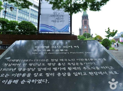 이재명 의거지는 1909년 12월 22일, 청년지사 이재명이 친일 매국노 이완용을 처단하기 위해 의거한 곳이다. 매국노 이완용이 거만한 모습으로 인력거를 타고 앞으로 지나갈 때 비수를 들고 이완용에게 달려들어 이완용의 허리를 찌르고, 대한독립만세를 외치던 중, 경호하던 일경들의 칼에 하체가 상하게 되어 붙잡혀 1910년 9월 30일 순국하였다. 이에 이재명 지사를 기리기 위하여 서울시에서 표지석을 설치하였다. (출처 : 국가보훈부)