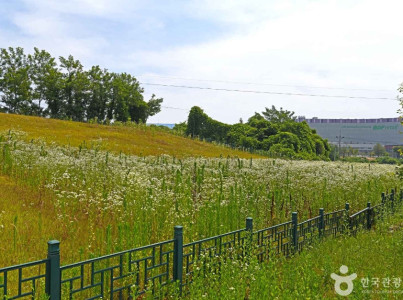 해금강 가는 길 왼쪽으로 내려가면 도장포 마을이 나오고, 그 마을 북쪽에 자리 잡은 곳이 바로 바람의 언덕이다. 원래의 지명은 ‘띠밭늘’로 불렸으나, 2002년부터 ‘바람의 언덕’으로 바뀌어 불리고 있다. 언덕에서 바다를 바라보면 한 없이 넓고, 고즈넉하며, 시원한 바람이 상쾌함을 선사한다. 여기서 보이는 것들은 하나같이 지루하지 않은 한가함을 입었다.섬도, 등대도, 유람선도, 바람마저도 한가해 보인다. 짊어진 마음의 짐을 바다에 던지거나 바람에 날려 보내기에 최적의 장소이다. 2009년 11월 풍차를 설치하여 관광객들에게 볼거리를 제공하고 있다. (출처 : 거제 문화관광 홈페이지)