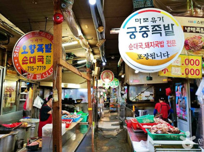 시장 골목 한쪽에서 시작한 족발집이 골목을 이루고 시장 상권보다 오히려 더 활발하게 손님을 모으고 있는 곳이 있다. 그곳이 바로 공덕동 족발골목이다. 30년 전 시장 한쪽에 자리 잡은 2평짜리 식당이 족발골목의 뿌리다. 당시 시장 사람들의 식사를 위해 순댓국을 끓였고 팍팍한 생활을 달랠 술안주로 족발을 만들어 냈다. 순댓국과 족발은 그렇게 시장 사람들의 속과 마음을 달래주면서 점차 식당이 잘 되자 시장 안의 가방 가게가 업종을 변경해 순대와 족발을 팔기 시작했다. 이렇게 주변에 족발집이 늘어나면서 어느덧 이 골목이 족발 골목으로 자리 잡았다. 세월이 흐르며 손님이 시장 사람들에서 학생과 주변 직장인들로 늘어가며, 손님들은 낮에는 나이 드신 분들이 많고 저녁에는 젊은 사람들이 많다. 나이 든 분들은 청춘 시절, 이 골목에서 술잔을 나누었던 추억을 찾아오고 젊은이들은 그들의 추억을 만들며 활기찬 밤 술자리를 만들어 간다. 손님도 세대가 바뀌었지만 이 골목 식당 가운데는 대를 이어 순댓국을 팔고 족발을 만드는 집도 있으니 오래된 옛 맛을 찾아가 보는 것도 괜찮다.