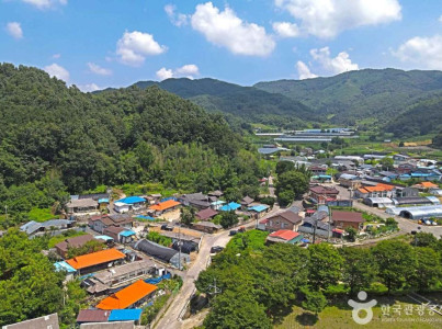 노채 마을은 소백산맥의 여맥(餘脈)을 등지고 금강 상류가 흐르고 있는 산간 지역 마을로서 분지(盆地)와 계단식 농토를 가지고 있는 마을이다. 주변 산세가 중국의 노산과 비슷하다고 해 노산 마을이라고 불리기도 했다고 한다. 노채 마을 동남쪽에는 국사봉(756.6m)이 있고, 동북쪽에는 형제봉(579m)이 있으며, 국사봉의 산줄기가 마을 주변까지 형성되어 있어, 마을 전체가 산에 둘러싸여 있다. 또한 노채 마을이 풍수지리적으로 배의 형국이기 때문에 배가 안정되게 운항할 수 있도록 돛대의 역할을 하는 2개의 짐대를 세웠다고 한다. 노채 마을 입구 오른쪽에 작은 개울이 흐르고 그 건너편에 노산정(魯山亭)이라는 정자가 있다. 노산정은 20여 년 전에 세워진 것으로 위치상 비보의 기능도 함께 담당하고 있다.