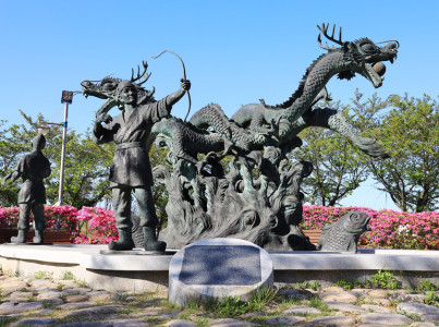 범바위를 지나 영랑호 둘레길을 따라 걷다 보면 영랑호 습지생태공원을 만날 수 있다. 가을이면 은빛 억새가 낭만적인 풍광을 자아내는 곳으로, 그 입구에 영랑호 설화공원이 있다. 영랑호 설화공원은 영랑호에 얽힌 설화를 조각상으로 재현한 공간이다. 공원에 들어서면 파도 위에 솟아오른 두 마리 용이 보인다. 용 주변으로 네 명의 화랑이 보이는데, 이곳 호수에서 수련했다고 하는 화랑 영랑의 모습을 형상화한 것이다. 영랑은 이곳 호수에서 수련하다가 불교의 관음보살을 직접 만났고, 관음 바위로 불리는 이곳에서 마침내 승천했다는 이야기가 전해진다.