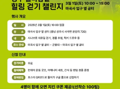 국내 1위 러닝 어플 ‘런데이’와 함께하는 걷기 행사로, 충청남도(예산, 공주, 논산, 금산) 4개 지자체와 전북특별자치도(진안, 완주) 2개 지자체의 시나브로 치유길을 함께 걷는 행사이다. 참가자는 공주 마곡사 솔바람길을 따라 걸으며 자연 속에서 몸과 마음을 치유하는 시간을 가질 수 있다. 이번 행사는 다양한 프로그램을 운영하기보다 참가자가 시나브로 치유길을 온전히 체험하며 힐링하는 데 초점을 맞추었다. 특히 마곡사 솔바람길에서는 마곡사의 따뜻한 분위기 속에서 자연을 느끼며 한잔의 차를 마시는 특별한 프로그램을 마련해 참가자들이 더욱 깊은 휴식을 경험할 수 있도록 했다. 자연 속에서의 걷기를 통해 참가자가 일상의 스트레스를 해소하고 건강한 에너지를 얻을 수 있도록 기획된 행사이다.