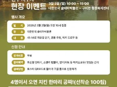 국내 1위 러닝 어플 ‘런데이’와 함께하는 걷기 행사로, 전북특별자치도(진안, 완주) 2개 지자체와 충청남도(예산, 공주, 논산, 금산) 4개 지자체의 시나브로 치유길을 함께 걷는 행사이다. 참가자는 완주 구이저수지를 따라 걸으며 자연 속에서 몸과 마음을 치유하는 시간을 가질 수 있다. 이번 행사는 다양한 프로그램을 운영하기보다 참가자가 시나브로 치유길을 온전히 체험하며 힐링하는 데 초점을 맞추었다. 특히 완주 구이저수지 편에서는 지역에 대한 이해를 높이기 위해 완주 관련 퀴즈쇼를 함께 진행한다. 자연 속에서의 걷기를 통해 참가자가 일상의 스트레스를 해소하고 건강한 에너지를 얻을 수 있도록 기획된 행사이다.