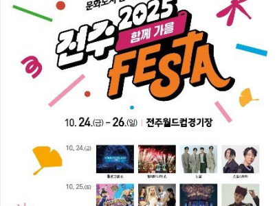 전주페스타 2025 축하행사는 9월에서 10월 동안 전주 곳곳에서 이어지는 통합축제의 하이라이트 축제로, 가을 전주의 문화와 열정을 집약해 선보이는 대표 행사이다. 다양한 어린이 체험 프로그램과 팝업스토어가 운영되어 가족 단위 관람객이 함께 즐길 수 있는 공간이 마련되며, 가수 초청 공연과 지역 예술인 무대, 세대별로 즐길 수 있는 다양한 음악·퍼포먼스가 어우러져 풍성한 볼거리를 제공한다. 또한 전주의 맛과 멋을 표현하는 무대 연출과 참여형 콘텐츠가 함께 어우러져 시민과 관광객 모두가 즐길 수 있는 가을 축제의 특별한 장을 만들어 낸다..