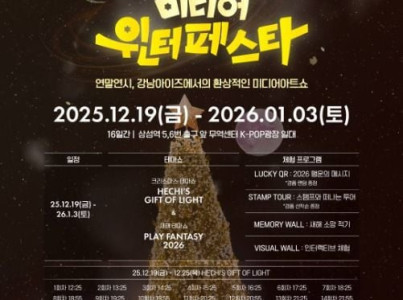 한 해를 마무리하고 새로운 시작을 맞이하는 시기, 삼성동 무역센터 일대가 환상적인 미디어아트와 빛의 향연으로 물든다. 2025 강남 미디어 윈터페스타는 크리스마스의 따뜻함을 한국적으로 재해석한 K-크리스마스 미디어아트와, 2026년 붉은 말의 해를 경쾌하게 밝히는 새해 미디어아트를 선보이는 연말?연초 축제이다. 총 두 가지의 미디어아트 테마쇼와 네 가지의 다양한 체험 프로그램으로 구성되어 관람객에게 생생한 시각적 몰입감과 다채로운 참여 경험을 제공한다. 12월 19일부터 25일까지는 크리스마스 테마쇼 , 12월 26일부터 1월 3일까지는 새해 테마쇼 이 이어지며 서로 다른 두 분위기를 통해 연말?연초에만 느낄 수 있는 특별한 감동을 선사할 예정이다.