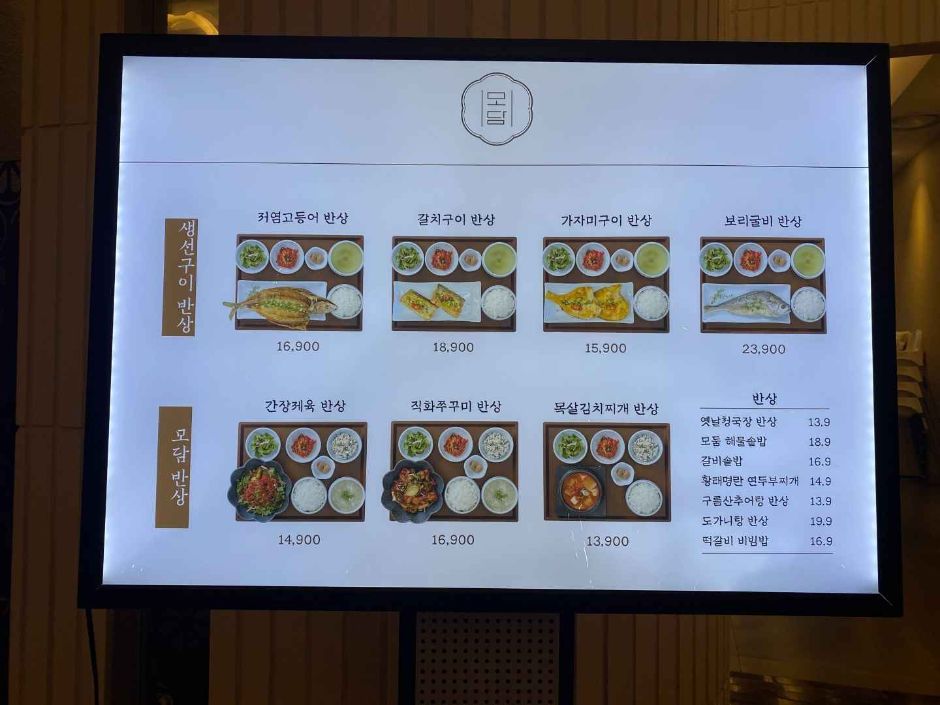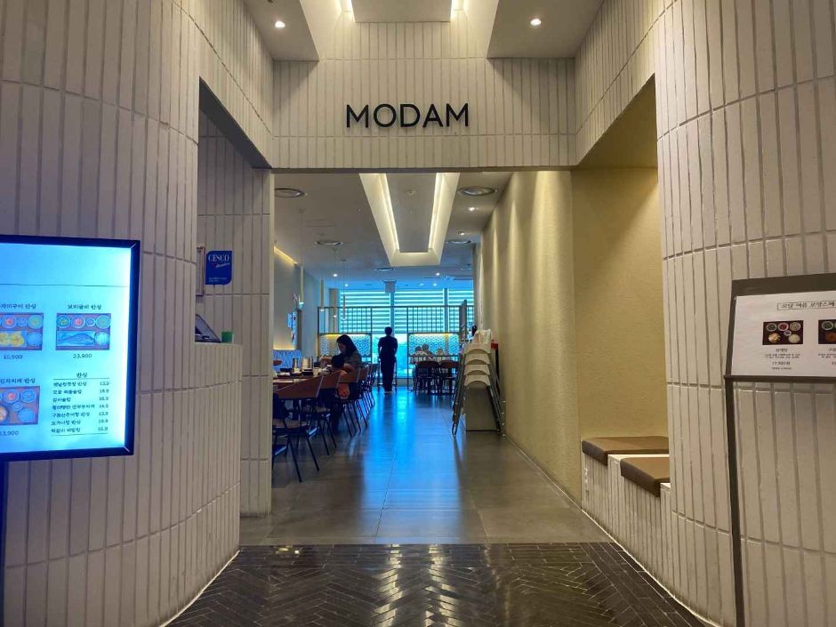 - 한식반상을 판매하는 모담 현대백화점킨텍스점은 일산 현대백화점 8층 식당가에 위치하였으며 간장제육, 구름산추어탕, 모둠해물솥밥, 갈비솥밥, 전복떡갈비덮밥, 보리굴비, 김치찌개, 연두부찌개, 쭈꾸미볶음 등 바다와 육지를 모두 아우르는 재료로 한식 반상을 구성하였다. 백화점 내부 통로와 엘리베이터, 수유실과 아기의자, 장애인 주차장과 장애인 화장실까지 편의시설이 잘 구축되어 있다. 특히 수유실은 엄마 수유실, 가족 수유실, 메인 홀, 키친에 각종 이유