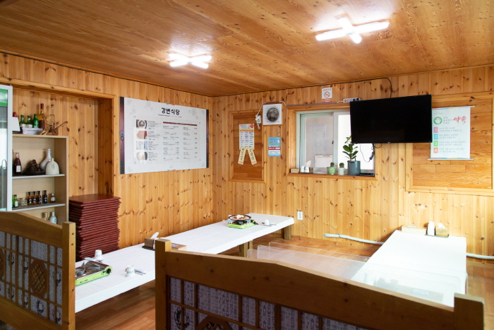 강변식당은 지리산 둘레길 옆에 위치한 음식점으로 이미 산청에서는 로컬 맛집으로 유명한 식당이다. 민물고기를 주 재료로 요리하지만 비린내가 나지 않고 깔끔한 맛이 이 식당의 특징이자 장점이라고 한다. 대표 메뉴 중 메기찜에는 독특하게 메기 위에 깻잎이 덮여져 나오는데, 이 깻잎이 음식의 풍미를 좀 더 살리면서 음식의 조화를 높이는 재료인듯하다. 이외에도 자라탕, 자라찜을 판매하고 있다.