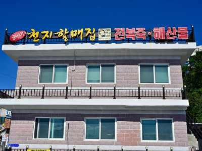 해녀천지할매집은 기장군 기장읍 연화리에 있다. 당일 신선한 해산물을 직접 공수하여 신선한 해산물을 저렴하게 제공하는 곳으로 전복죽은 전해 오는 비법으로 만들어진다. 천지전복죽, 특전복죽, 성게전복죽, 낙지전복죽 등 전복죽의 종류가 다양하고, 해산물은 해삼, 소라, 낙지, 성게 등이 준비되어 있다. 해산물들을 한번에 즐길 수 있는 모듬해산물 메뉴도 있어 다양한 메뉴 시식이 가능하다. 주차가 편리하며, 실내외 좌석이 마련되어 있어 방문객들이 편안하게 식사할 수 있다. 또한, 포장 주문도 가능해 집에서도 해녀천지할매집의 신선 해산물을 즐길 수 있다.