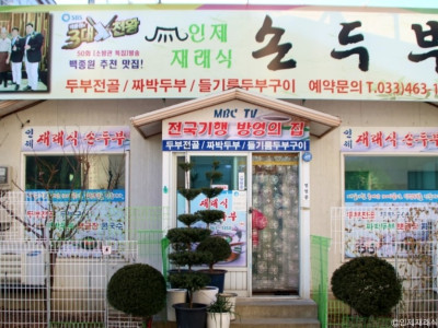 강원도 인제군 인제산촌민속박물관에서 가까운 손두부 맛집이다. 인제에서 나는 콩만 사용하여 매일 두부를 만들어 요리에 사용한다. 대표 메뉴는 손두부로 만든 짜박두부와 들기름 두부구이다. 아침 10시 오픈과 동시에 테이블이 다 차는 곳으로 백종원의 삼대 천왕을 비롯해 여러 프로그램에서 소개한 곳이다. 짜박두부는 찌개보다 국물이 적어 자박자박하고 칼칼한 양념으로 끓여 먹는데, 다른 반찬이 없어도 밥 한 공기를 비울 수 있다. 물론 기본 찬으로 강원도식 밥반찬들도 정갈하게 잘 나온다. 들기름 두부구이는 도톰한 손두부를 들기름으로 구워내는데 고소하고 건강한 맛이다.