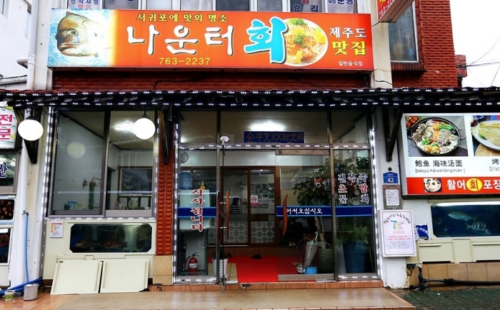 서귀포 나운터횟집은 중문관광단지에서 차량으로 10분 거리 내 위치한 횟집이다. 서귀포매일올레시장 인근에 있으며, 각종 활어회를 신선하게 먹을 수 있다. 고등어회, 방어회, 돌돔회, 참돔회, 구문쟁이회, 뱅어돔회 등이 준비되어 있으며, 인근에 천지연폭포, 새연교, 서귀포항여객터미널, 서구포항, 서귀포시립해양공원이 위치해 있어 연계관광으로 방문하기에도 좋다.