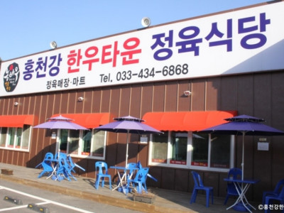 홍천강 한우타운은 강원도 홍천에 있는 가성비 좋은 정육식당이다. 팔봉산에서도 가깝고 소노펠리체 CC에서도 가까워 등산객이나 골퍼들이 즐겨 방문하는 고깃집이다. 정육점에서 먼저 고기를 고른 후에 상차림 비용을 내고 구워 먹으면 된다. 품질 좋은 고기를 제공해 식사 후 포장하는 경우도 많다. 고기 외에 한우국밥, 왕갈비탕, 뚝 불고기 등 단품 메뉴도 있다. 매장 앞에 널찍한 전용 주차장이 있어 주차하기 편리하다.