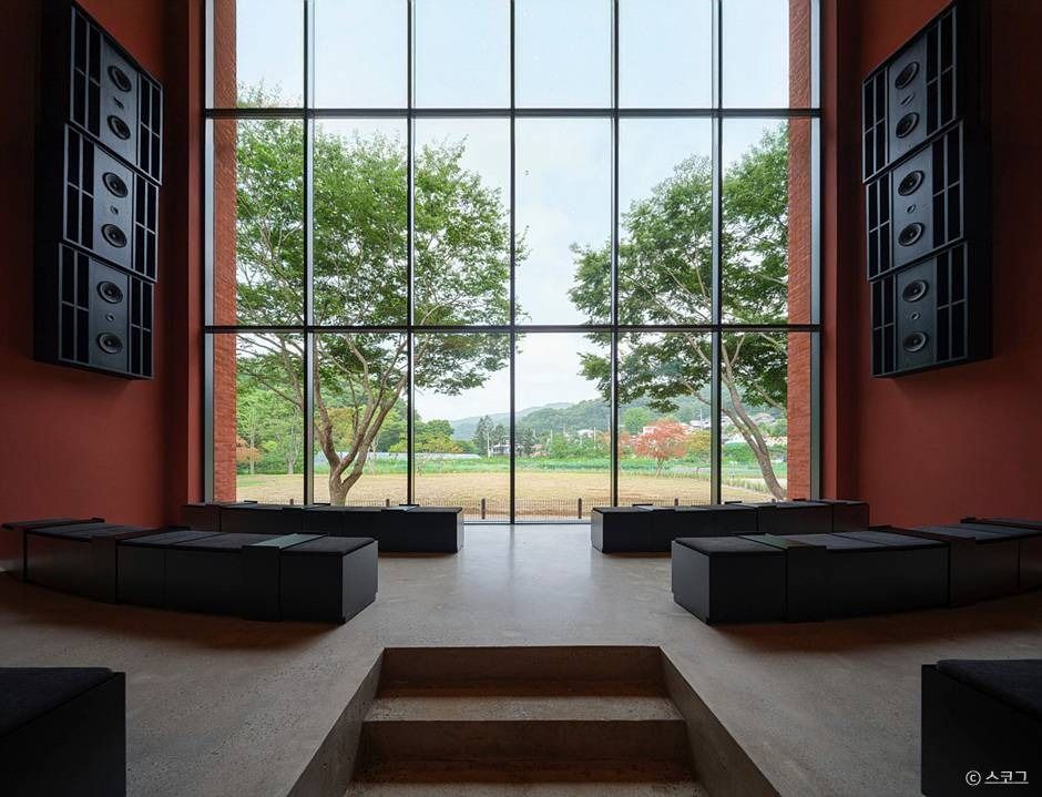 카페에는 음악 감상에 특화된 ‘청음관’이 조성되어 있다. 수직으로 배치된 대형 스피커를 양쪽에 두어 마치 자연을 배경으로 한 공연장을 연상시킨다.
