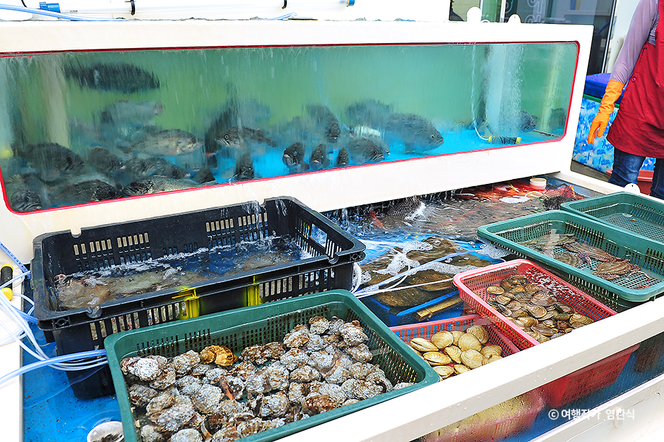 신진도 수산물 직판장 바로 뒤편에 위치한 옥양 수산은 자연산 활어를 이용한 물회가 맛있는 집이다. 그 중에서도 특히 서해안에서 흔치 않은 오징어물회를 맛보기 위해 이 집을 찾는 손님들이 많다. 옥양 식당의 오징어물회는 중매인인 남편과 일식당을 운영했던 경험이 있는 아내가 합심하여 독창적으로 만들어낸 작품이다. 먹기 좋게 채 썰어 낸 싱싱한 오징어회에 적양파와 오이, 당근, 상추, 깻잎을 채 썰어 넣고 입맛 돋우는 빨간 육수를 부은 오징어물회는 특히 더위에 지친 속을 말끔히 식혀준다. 육수의 자극적이지 않고 은은한 새콤한 맛은 직접 담근 천연 과일 식초와 매실 효소를 이용하여 만든 것. 신진도에서 잡히는 오징어는 7월부터 제철이지만 봄에는 주로 갑오징어로 물회를 만든다. 갑오징어 맛은 오징어와는 비교할 수 없이 쫀득하고 찰진 것이 특징이다.