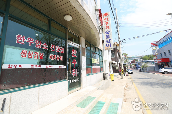 한수위숯불갈비는 간성읍 하리마을회관에 위치하고 있다. 고급스러운 인테리어로 꾸며진 고기 전문식당으로 다른 곳에서 오랫동안 영업하다가 현 장소로 이전하여 내부에는 가운데에 큰 홀과 2개의 방이 있다. 비교적 저렴한 가격에 한우 생갈비 구이를 맛볼 수 있으며, 강원도의 청정 자연을 바라보면서 고기를 먹을 수 있어 운치를 더한다.