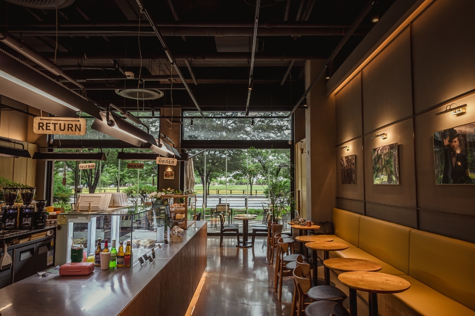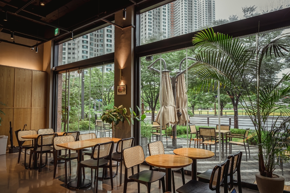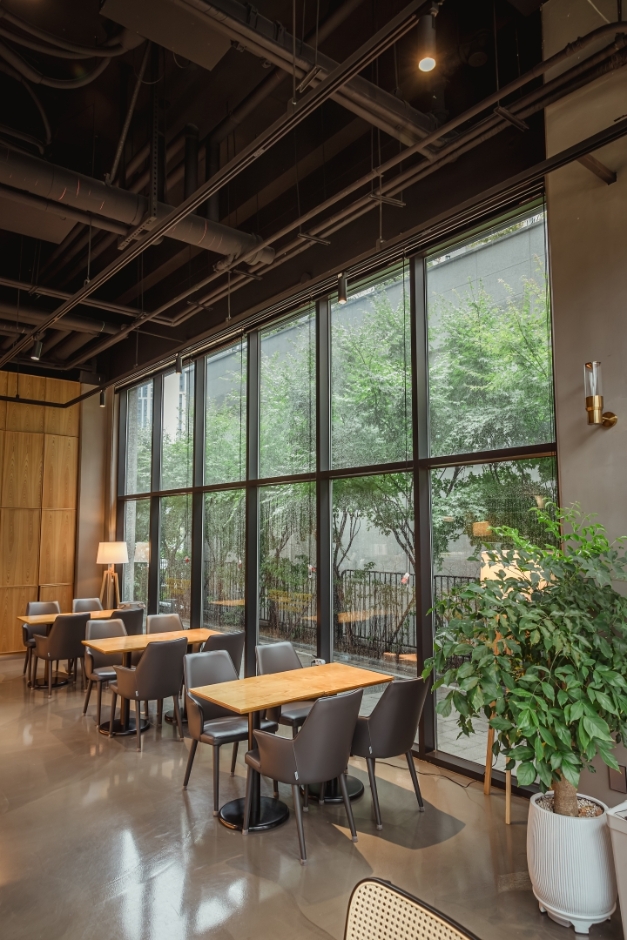 먹고사는 것보다 중요한 건 없다며 농담 같은 진담을 건네고, PT를 드롭하라는 힘든 충고를 하는 가운데 유정석과 최정민의 우정이 느껴지는 장면이다. 높은 천장과 세련된 인테리어가 그들이 속한 현실을, 우드 톤의 가구와 곳곳의 식물이 그들의 우정을 보여주는 듯하다. <대행사> 외에도 다양한 드라마를 촬영한 카페이다.