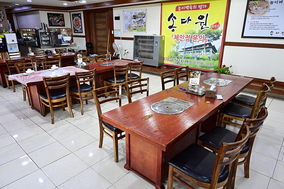 옥과 IC에서 5분 거리에 있는 송다원은 닭, 오리 능이백숙 삼계탕 전문점이다. 전통 정자가 맞이하는 이곳은 한옥 지붕 양식으로 지은 2층 건물로 넓은 주차장에 높게 자란 소나무들이 멋진 전경을 더한다. 실내와 외부에 각각 넓은 입식 테이블을 비롯하여 2층에는 연회장과 객실이 있어 단체 방문 및 MT까지도 가능하다. 능이 삼계탕은 오가피, 엄나무, 황기, 작약, 두충, 당귀, 숙지황 등 한약재가 20가지 들어가 있다. 곡성생태체험관, 무창체험마을 등이 주변에 있어 연계 관광하기 수월하다.