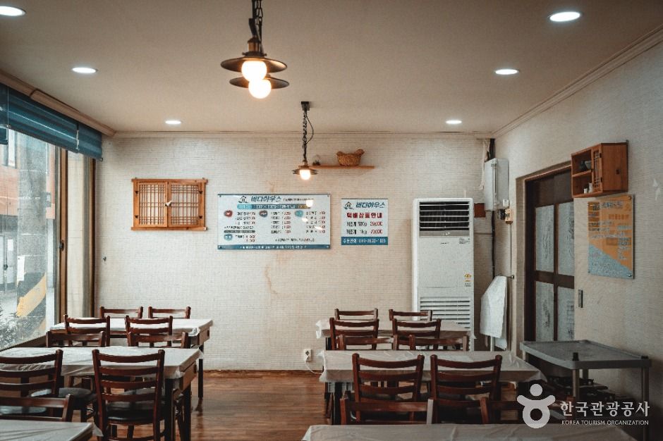 장흥 수문해수욕장과 수문항 사이의 방파제 앞에 자리 잡고 있는 향토 맛집이다. sbs의 맛대맛에 소개되고 나서 유명세를 치르기 시작했지만, 지역에서는 오래전부터 바지락 회로 소문이 자자했던 집이다. 조갯살에 미나리와 양파를 더해 고추장과 식초에 무쳐내는데 자극적이지 않은 새콤함 뒤에 단맛이 도는 게 독특하다. 여기에 중간중간 입맛을 달래라고 개운한 바지락 탕도 함께 제공한다. 소문난 바지락 회의 비결은 이 집에서만 사용하는 식초에 있다. 청주 됫병에 담겨 주방 한켠에 비밀스럽게 숨겨놓은 식초는 막걸리를 발효시켜 만들었다고 한다. 직접 만든 막걸리를 한 번 더 삭혀 식초를 얻는다. 고추장 역시 직접 만들고 막걸리 식초를 가미해 초장을 만든다. 바다 하우스는 키조개, 바지락을 전문으로 취급하지만 철에 따라 전어, 농어, 하모(갯장어) 등도 회로 내놓는다.