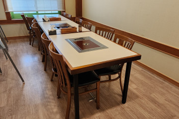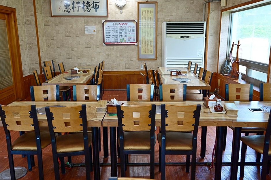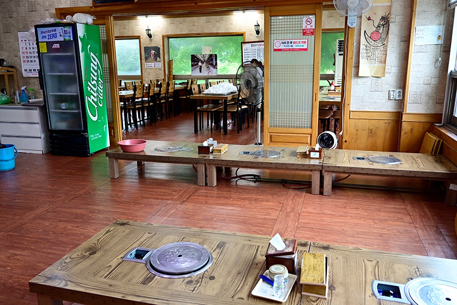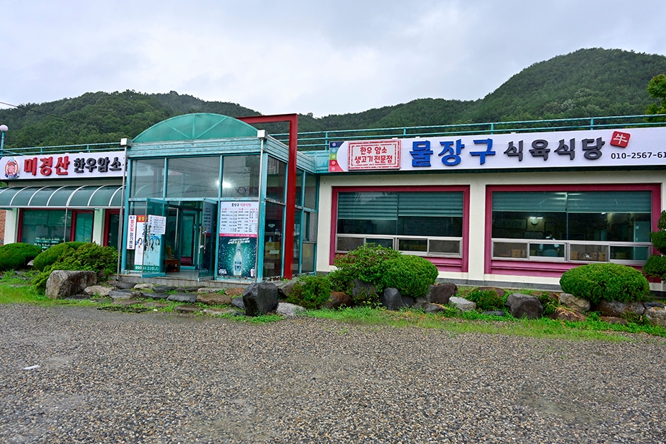 건물 앞에 넓은 주차장이 있는 물장구식육식당은 한우를 저렴하게 맛볼 수 있는 산청 식육식당이다. 식당 안으로 들어가면 즉석에서 한우를 손질하는 모습을 바로 볼 수 있다. 쌀, 배추 등 식재료가 모두 국산이며 가격도 저렴한 편이다. 보통 한우집이 100g 기준인 데 비해 이곳은 200g 기준으로 가성비가 좋은 식당이다. 고기를 먹고 나면 직원분이 면과 된장찌개를 세팅해 준다. 황매산이나 경호강 등을 찾을 때 방문하면 좋다.