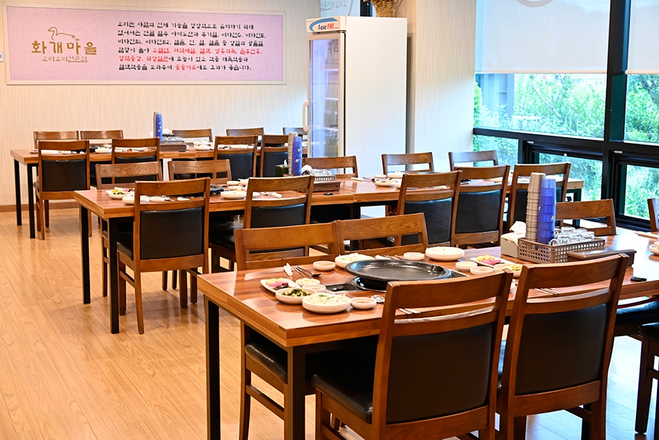 진주에 있는 오리고기 전문점 화개마을은 주차 공간이 넓고 방문객이 많아 따로 주차요원이 있다. 유명한 오리고기 맛집으로 웨이팅이 필수이다. 밖에는 대기하는 공간이 따로 마련되어 있으며 8인 이상 방문할 때는 예약도 가능하다. 식사 공간은 입구를 중심으로 신발을 벗고 식사하는 자리와 신발을 신고 식사하는 자리로 나뉜다. 안쪽에 단체석이 마련되어 있어 단체 모임이나 가족 모임을 하기 좋다. 고기가 부드럽고 연해서 부모님은 물론 어린이가 먹기에도 좋다. 또한 고기를 먹은 후 볶음밥과 들깨수제비를 주문할 수 있다.