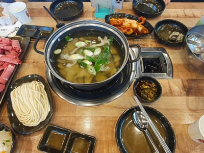 안동전골 칼국수는 넓은 매장에 신선한 재료가 준비되어 있다. 소고기 샤부샤부를 주문하면 먼저 바지락과 수제비가 들어 있는 기본 육수가 제공되고 고기(1인 150g)와 숙주나물, 버섯 종류, 청경채가 차려진다. 모든 재료가 신선하다. 육수가 보글보글 끓기 시작하면 야채를 넣어 주고 버섯, 소고기, 기타 재료들을 익혀 먹으면 된다. 셀프 바가 있어서 자유롭게 가져다 먹을 수 있다.