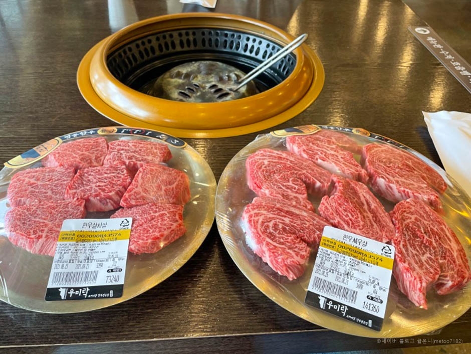 우미락은 정육식당처럼 입구 좌측에 자리한 판매장에서 안심, 꽃등심, 채끝, 갈빗살, 살치살 등 숙성된 고기를 골라 결제한 후에 식당으로 가져가서 먹으면 된다. 식당 내부는 넓고 테이블도 많으며 예약하면 룸도 이용할 수 있다. 상큼한 유자 샐러드와 백김치, 명이나물, 상추 겉절이 등 고기와 곁들여 먹기 좋은 기본 상차림이 나오며, 상차림 비용은 없다. 더 필요한 반찬은 셀프 바를 이용하면 된다.