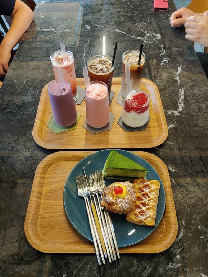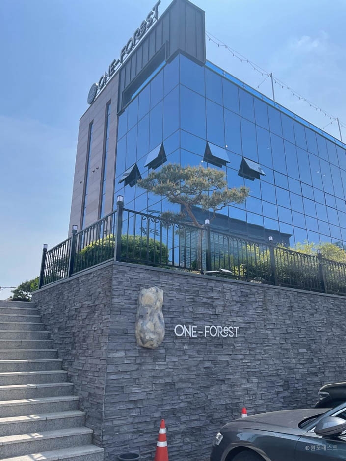 원포레스트는 이름에서 느껴지듯이 조경을 신경 써서 숲속에 온 듯한 느낌을 주는 대형 카페다. 1층과 2층 테라스로 이루어져 있는데 1층은 우드톤의 편안한 느낌이고 1층에서 통창을 통해 야외정원이 훤히 보여서 마치 숲속에 온 것 같은 기분을 갖게 해준다. 2층엔 중앙에 징검다리를 만들어 놓아서 시원한 개방감이 있다. 루프탑과 야외정원은 조경을 섬세하게 해 놓아서 아기자기 예쁘고 청량하다.