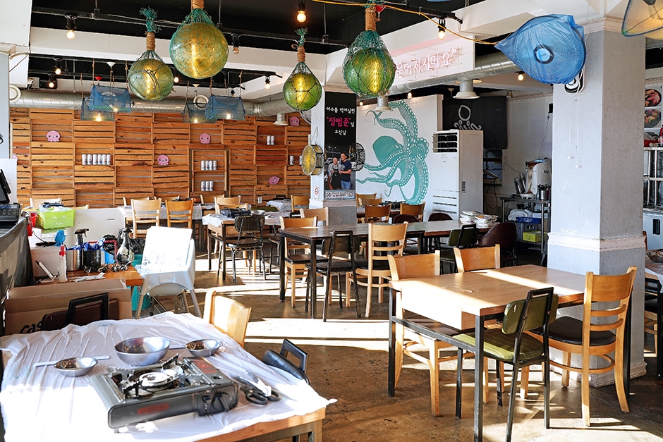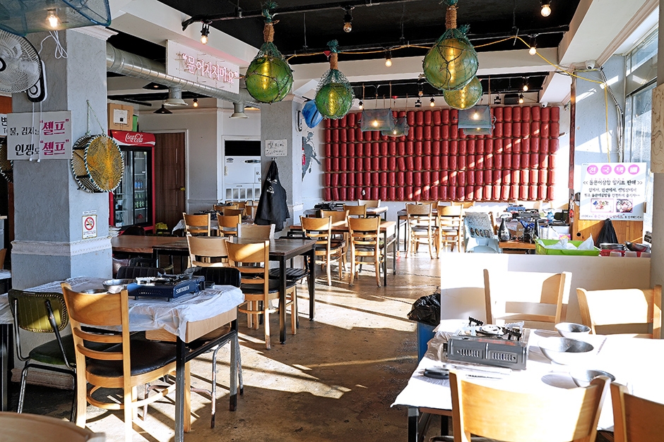 돌문어 상회는 돌문어삼합과 함께 전복물회, 라면 등 다양한 메뉴를 제공한다. 이곳의 대표 메뉴는 단연 돌문어 삼합이다. 돌판에 문어와 전복, 버섯, 단호박, 부추, 양파 등을 넣고 볶아 삼합처럼 즐기는 메뉴다. 먼저 삼겹살과 해산물, 갓김치를 구워 먹기 좋은 크기로 잘라 준 후 불판 가운데 버터를 넣고 모두 섞는다. 문어가 너무 빨갛게 익으면 질겨지니 먼저 먹는 방법을 추천한다. 다 먹었으면 고기와 야채를 조금 남긴 상태에서 밥을 볶아 먹으면 된다.