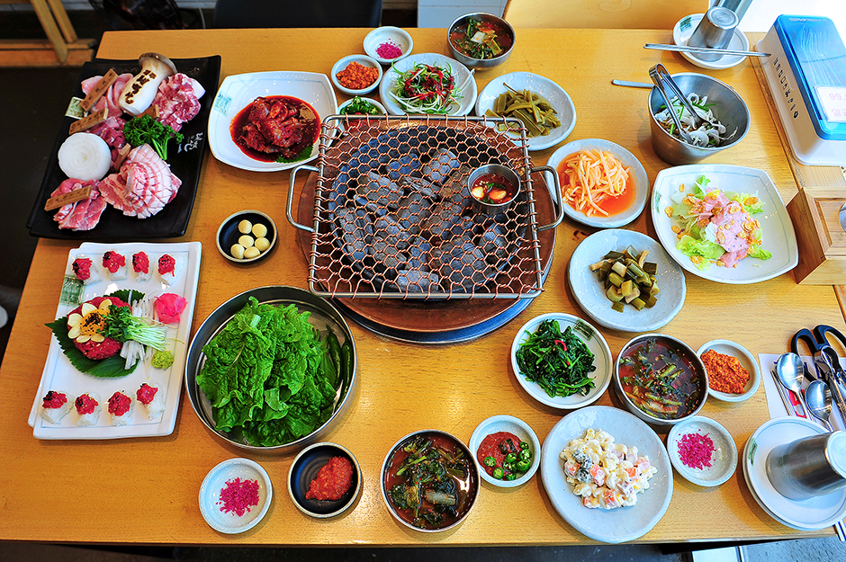 제주공항 근처에 위치한 제주 태백산 본점은 넓고 쾌적한 공간을 갖춘 흑돼지 고기 전문점이다. 태백산 한판 메뉴는 오겹살, 숄더랙, 생갈비 등 여러 부위를 한 번에 즐길 수 있어 인기가 높다. 매장 한편엔 한식 뷔페처럼 기본 반찬과 쌈 채소, 젓갈 등을 편하게 가져다 먹을 수 있는 셀프 바가 마련되어 있다. 주차 공간도 넓고 제주 공항 근처에 있어 제주도를 오고 가기 전에 방문하여 식사하기 좋은 곳이다.