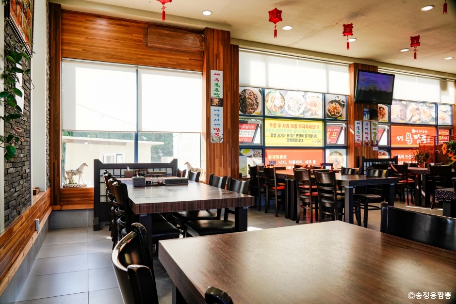 송정용짬뽕은 강원도 강릉시 송정동에 있는 중화요리 전문점이다. 다양하고 독특한 짬뽕이 많아 TV 프로그램에 소개되면서 더욱 유명해 진 곳이다. 찹쌀가루와 혼합 반죽해서 기름기 없이 개운한 해물짬봉, 신선한 동해 문어 한 마리가 올려져 있는 문어짬뽕, 신선한 해물이 푸짐한 황제 짬뽕, 여름에는 시원하게 먹을 수 있는 냉짬뽕 등 짬뽕 전문점이다. 자장은 해물 뚝배기에 담겨 나오는데 테이블에서 뚝배기를 데워가며 마지막까지 따뜻하게 먹을 수 있다. 겉은 바삭하고 고기는 부드러운 찹쌀 탕수육도 인기다. 주차는 매장 앞에 넓은 주차장이 있어 이용이 편리하다. 식당 내부가 깔끔하고 통유리를 통해 주변 경치를 둘러보며 식사할 수 있다.
