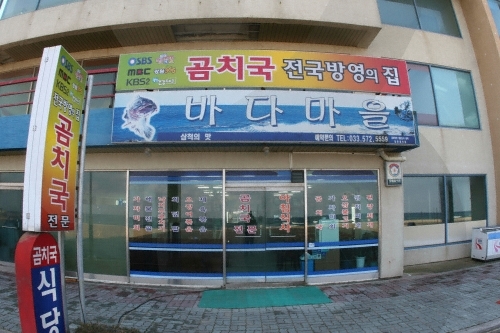 삼척해수욕장 내에 위치하여 시원한 파도소리를 들으며 맛있는 음식을 먹을 수 있는 바다마을은 곰치국, 가자미회, 낙지볶음 등 다양한 메뉴를 즐길 수 있다. 20년 노하우의 곰치국 단일메뉴로 삼척의 명물이라고 할 수 있는 곰치를 전문으로 하는 식당이다. 함께 나오는 밑반찬도 맛깔스럽다. 또한, 모두 금연석으로 지정되어 쾌적한 환경에서 신선한 음식을 맛볼 수 있다.