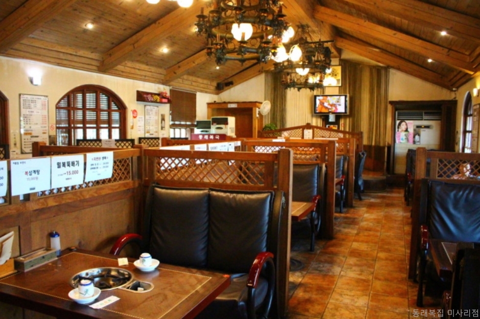 ?동래복집 하남미사점은 하남시 덕풍동 조정경기장 근처에 있다. 길에서 큰 간판이 보여서 찾기 쉽다. 주차는 식당 앞 주차장이 넓어 편안하게 할 수 있다. 식당 입구에는 복어가 있는 수족관도 있고 내부는 노포 느낌이 나는 우아한 나무 천장에 조명이 특이하다. 테이블 좌석 외에도 대형 홀과 룸이 있어 회식이나 단체 모임을 하기에 적합하다. 복국과 매운탕 외에도 복 코스 메뉴 등이 있고 민어 지리와 매운탕도 먹을 수 있다. 곁들임으로 복어 튀김과 복어 껍질 무침이 나와서 가격 대비 상차림이 푸짐하다.
