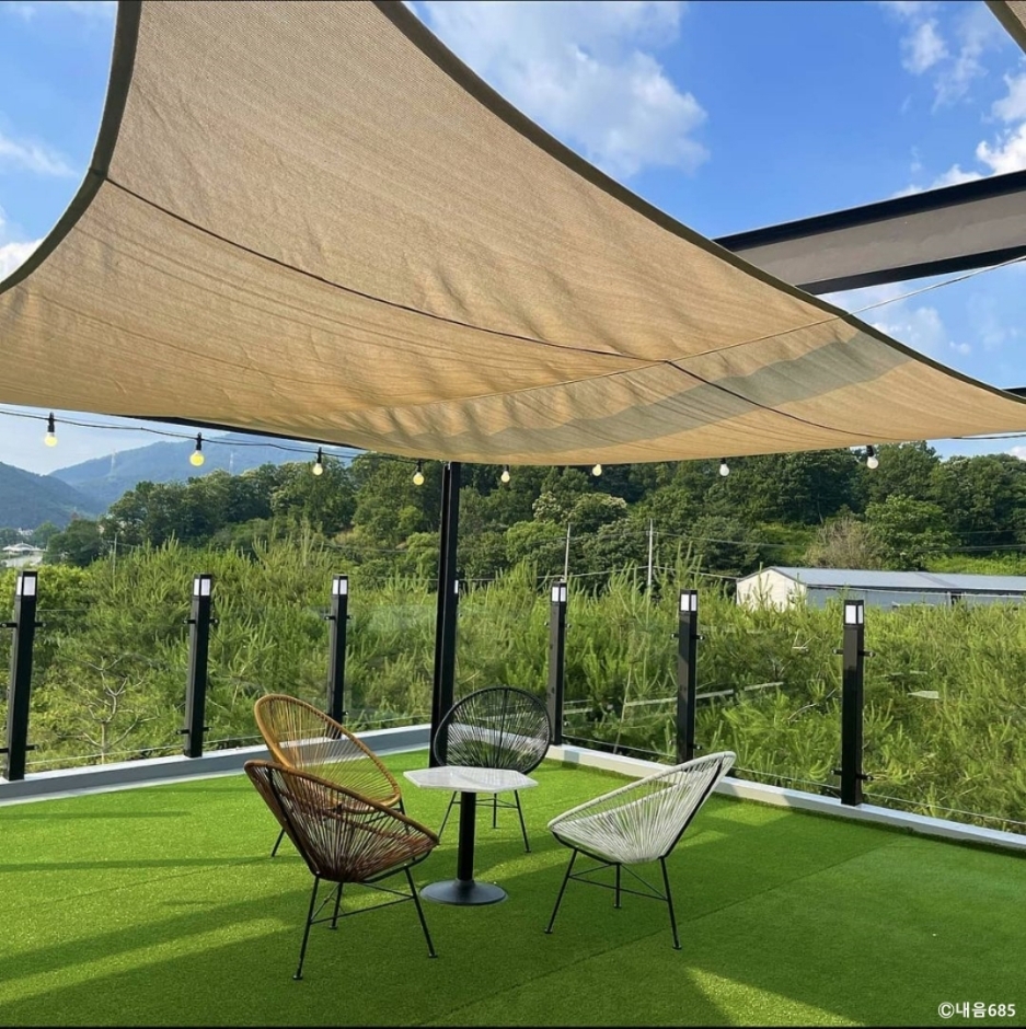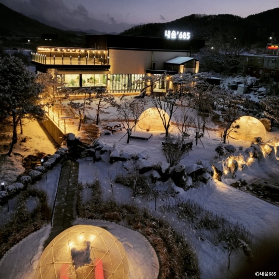 내음685는 포천시 내촌면에 있는 대형 베이커리 카페이다. 지번 주소가 음현리 685여서 이름이 내음 685이다. 주도로에서 조금 안쪽으로 들어와 있어 내비게이션을 잘 보고 찾아가야 한다. 제대로 찾아가면 넓은 전용 주차장이 나온다. 푸른 잔디밭과 넓은 정원, 루프탑을 모두 갖추었다. 천연 화이트 대리석을 사용한 인테리어에 층고는 높고 까만 창틀을 통해 보이는 초록 뷰가 멋지다. 실내에도 화분을 많이 배치해 화이트, 그린, 블랙의 조화가 세련된 느낌을 준다. 테이블 사이를 흰 커튼으로 장식해 공간 분리도 되고, 소음도 줄이면서 프라이빗한 공간을 만들었다. 개업 때부터 모든 빵은 당일 생산 당일 판매 원칙을 지키고 있다. 낮에는 초록의 뷰가 좋고 밤에는 잘 꾸민 정원에서 보는 야경이 좋은 카페이다. 베어스타운에서 5분 거리에 있어 가족 나들이 후 방문하기 좋고 데이트 코스로 가기도 좋다.