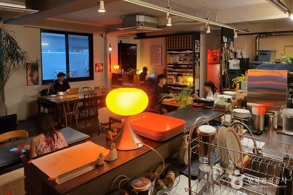 카페 B - hind는 대로 한복판이 아닌 대로 뒤편의 한적한 공간이라는 의미를 담고 있다. 뒷이야기가 많은 공간. 모두가 이 공간을 좋아하고 공간에 대해 대화하기를 바라는 마음을 담고 있다. 또,'B-'가 주는 아날로그적인 느낌의 공간 이미지와 컨셉을 담고 있다. 통유리창, 대형 칠판으로 꾸며진 벽, 아담한 외관과 같은 근사한 인테리어와 음악이 너무나 잘 어울이는 곳이다. 이달의 샌드위치를 정해서 내놓기도 하는데, 샌드위치의 맛 또한 훌륭하다. 와인의 초보자도 부담없이 즐길 수 있는, 달콤한 와인이 모여 있는 곳이기도 하다. 홍대 대학가에 위치해서인지 문화를 즐기고, 좋아하는 물품들을 사고 팔 수 있는 프리마켓도 열고 종종 전시회도 연다.