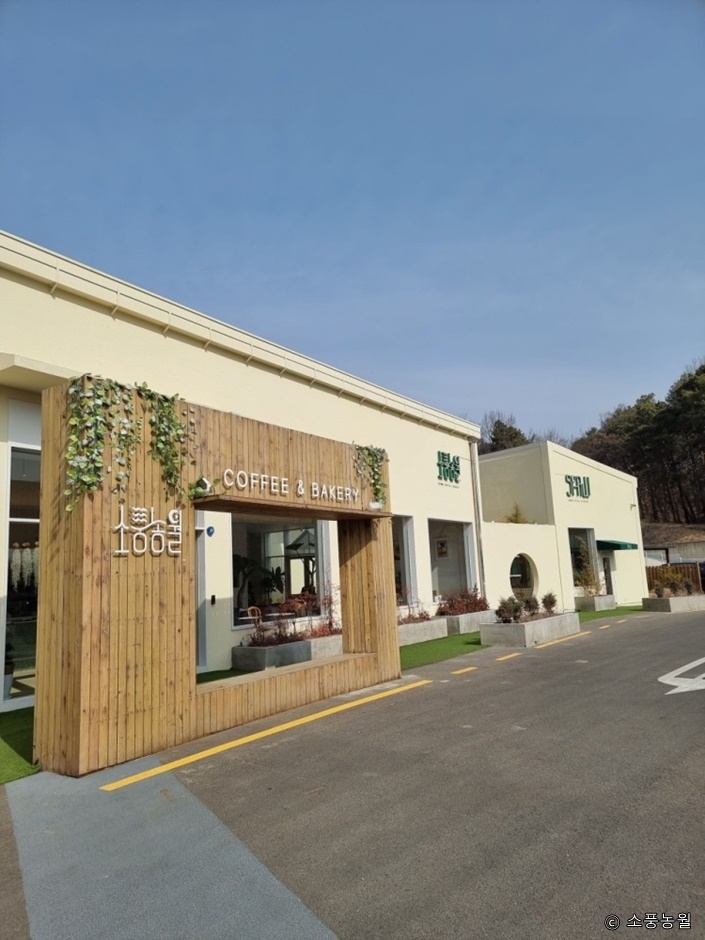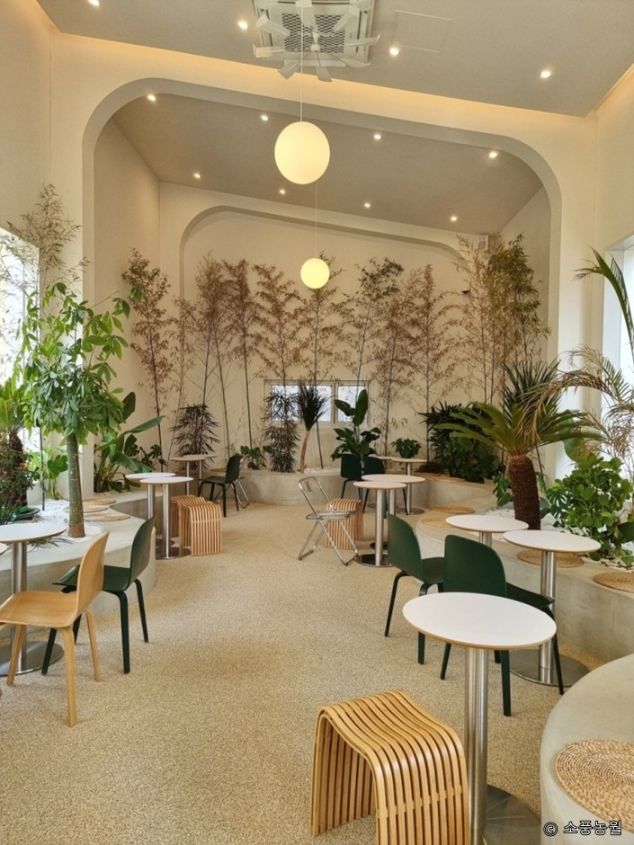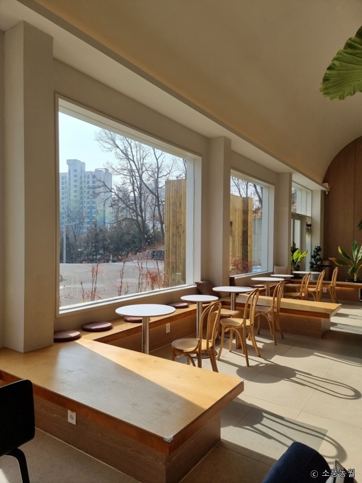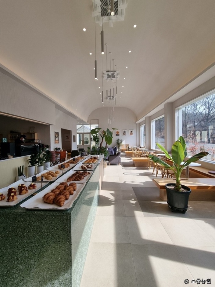 경기도 파주시 방촌로에 있는 베이커리 카페다. 높은 천장과 통유리 덕분에 실내가 훨씬 쾌적해 보인다. 2개의 건물로 나뉘어 있고, 그 사이에 야외 테라스를 꾸몄다. 건물 밖으로 나있는 돌계단을 오르면 넓은 잔디밭과 나무 테이블이 있어 아이들이 뛰어놀기 좋다. 실내 및 실외 좌석 모두 이용 가능하다. 실내 좌석 옆으로 다양한 식물들을 배치해 놓아 초록의 싱그러움을 느낄 수 있으며, 감성적인 분위기를 배경으로 사진 찍기에도 좋다.