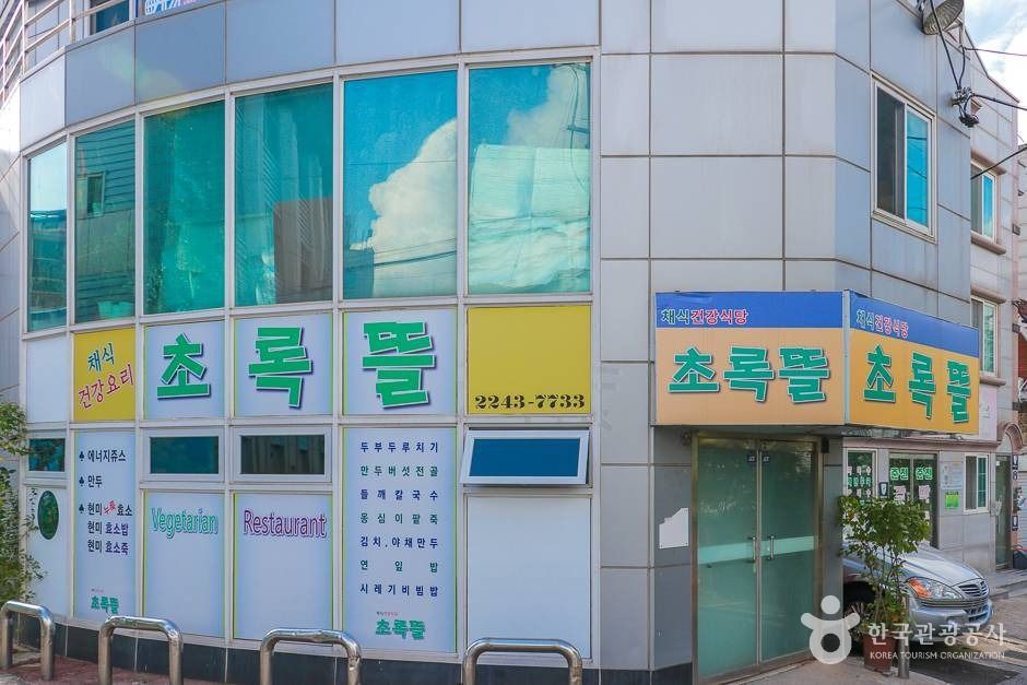 초록뜰은 채식 전문점으로 건강한 채식 메뉴를 제공하기 위하여 화학조미료 및 액젓 등 화학 첨가제를 일절 사용하지 않으며 천연의 조미료만을 사용하고 있다. 또한 불순물과 유해 성분이 제거된 구운 천일염으로 배추를 절여서 사용한다. 오신채 (파, 마늘, 부추, 달래, 흥거, 흥거가 없는 한국에서는 양파를 포함)를 사용하는 대신에 울금 등 다른 채소를 넣어 맛을 더하고 국수도 통밀, 현미, 흑미, 찰현미, 백태, 오트밀, 아마씨, 도토리가루, 울금 등을 배합하여 직접 제조하기 때문에 소화에 도움을 준다고 한다.