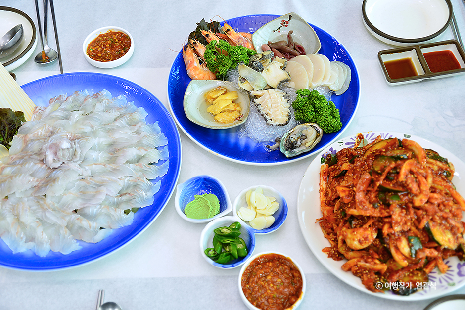 회가 나오기 전에 먼저 나오는 미역과 바지락이 듬뿍 든 미역국은 그 자체의 맛을 고스란히 살린 진하고 시원한 국물. 손님들이 감동하는 포인트는 도톰하게 썰어낸 회 맛도 좋지만, 곁들이 음식(츠케다시)이 가짓수만 채우기 위해서가 아닌 하나하나가 다 메인요리라 할 만큼 알차고 푸짐하기 때문. 매콤하게 무쳐낸 간재미무침, 우럭탕수육, 다슬기 무침, 간재미 무침, 생선구이 3종 세트, 양념을 얹은 조개찜, 해삼내장, 우럭탕수, 키조개구이, 복어껍질 무침 같은 음식들이 철을 달리해 상에 오른다. 또한 키조개가 많이 나는 오천항이니만큼 키조개 철인 4~5월에는 무침, 전골, 샤부샤부로 다양하게 맛볼 수 있다.