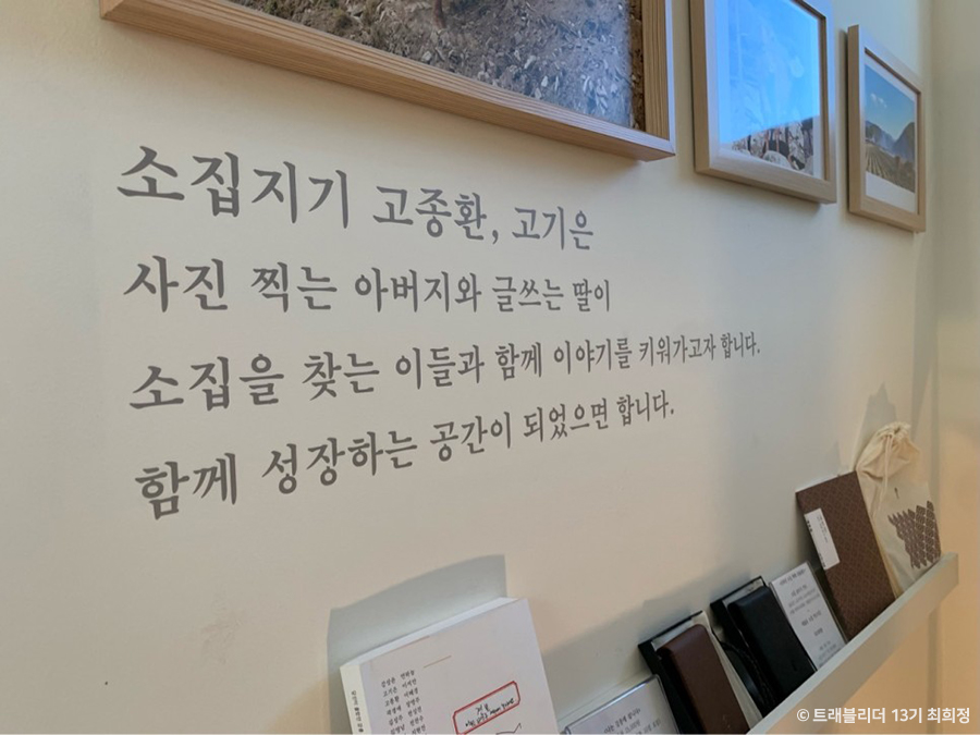소를 키웠던 공간이라는 의미를 가진 소집은 과거 외양간을 개조한 갤러리 겸 카페다. 그 때문에 여전히 공간 한쪽에는 외양간의 흔적이 고스란히 남아있다. 짧게 이야기를 적은 쪽지를 넣는 소 여물통 등 과거 외양간의 역사가 곳곳에 자리해 정겨운 분위기를 풍긴다. 소집은 여행과 책을 기반으로 한 전시회와 클래스가 주로 열리고 공간 대관도 이뤄진다. 갤러리는 지역 작가의 작품들을 선보이며 매달 새로운 전시를 만나볼 수 있다. 강릉을 배경으로 탄생한 다채로운 작품들을 둘러보며 예술적 감성을 충전하기에 더없이 좋다.
