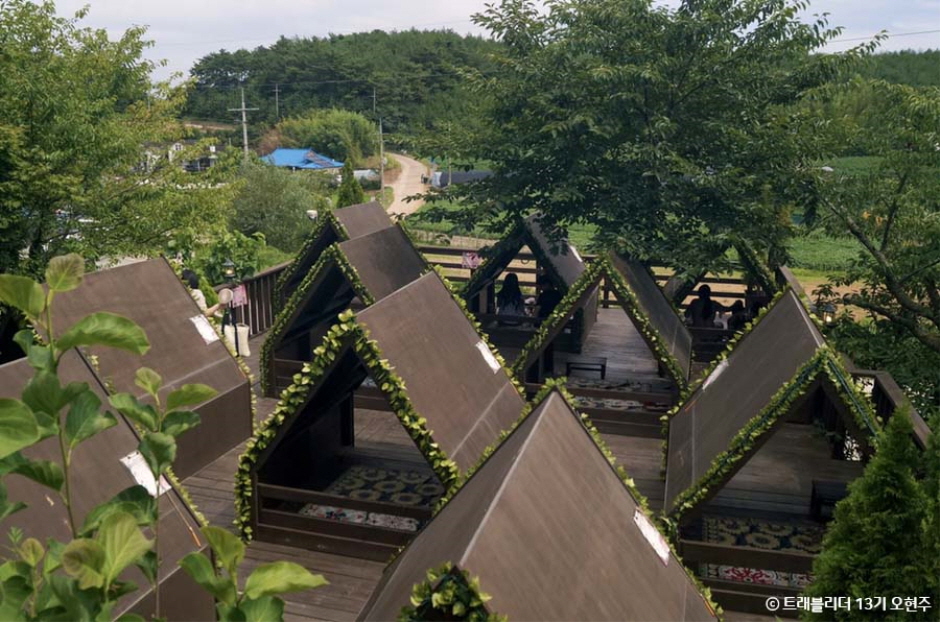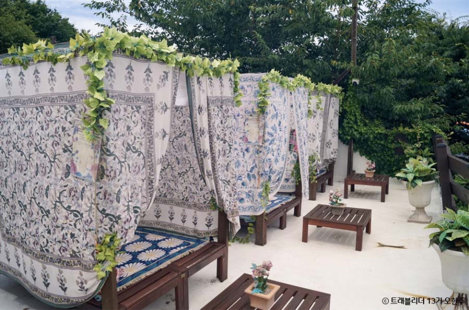 몽산포해수욕장에서 10분 거리의 안면도 작은 섬마을에 있는 카페다. 마치 동남아 휴양지에 와있는 듯 나무와 연못으로 꾸며진 정원 같은 테라스와 아기자기하게 꾸며진 실내공간에서 예쁜 사진을 찍어갈 수 있다. 특히 테라스에 있는 베드 존이 인기가 많아 1시간 이내만 사용하도록 안내하고 있다. 커피와 음료 외에 로스트비프 피자, 리코타 바질페스토 피자, 케이준 프라이드 등의 식사 메뉴와 팥빙수 같은 디저트 메뉴도 판매한다.