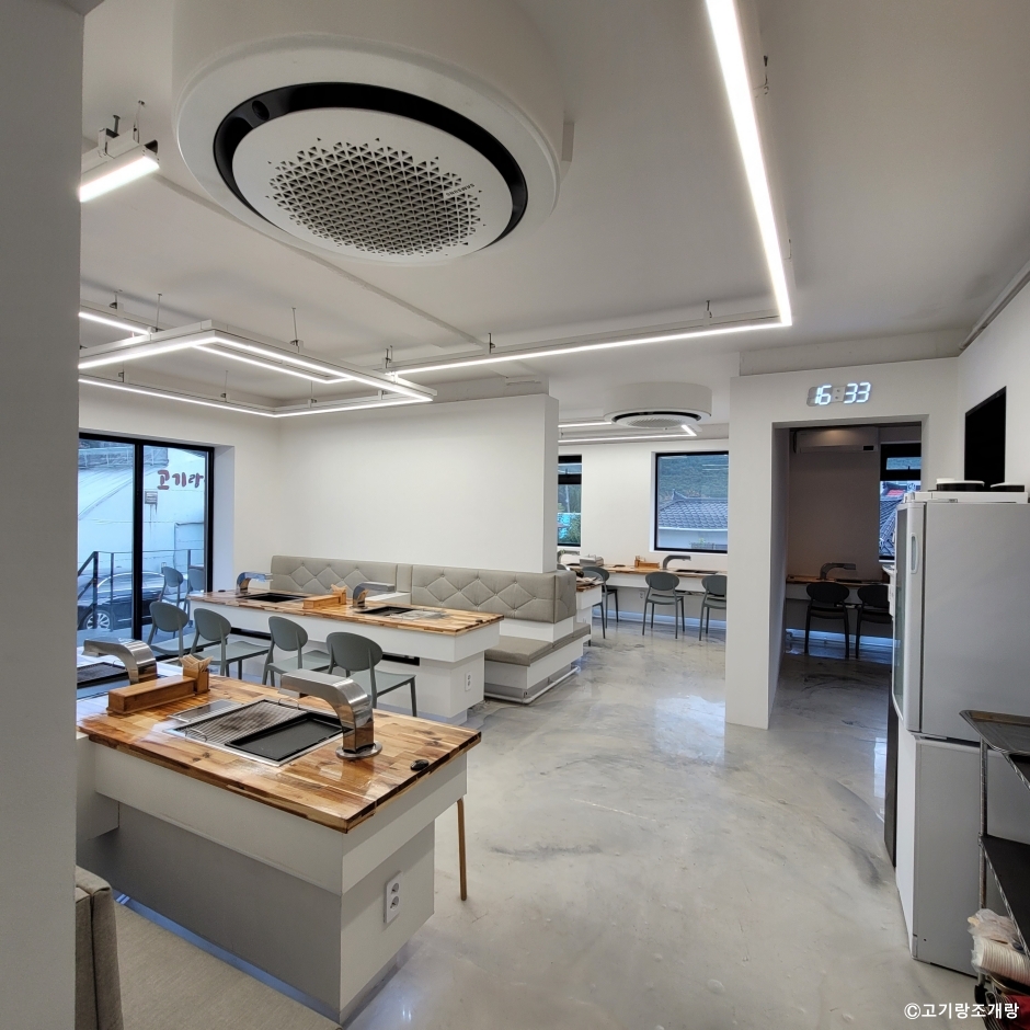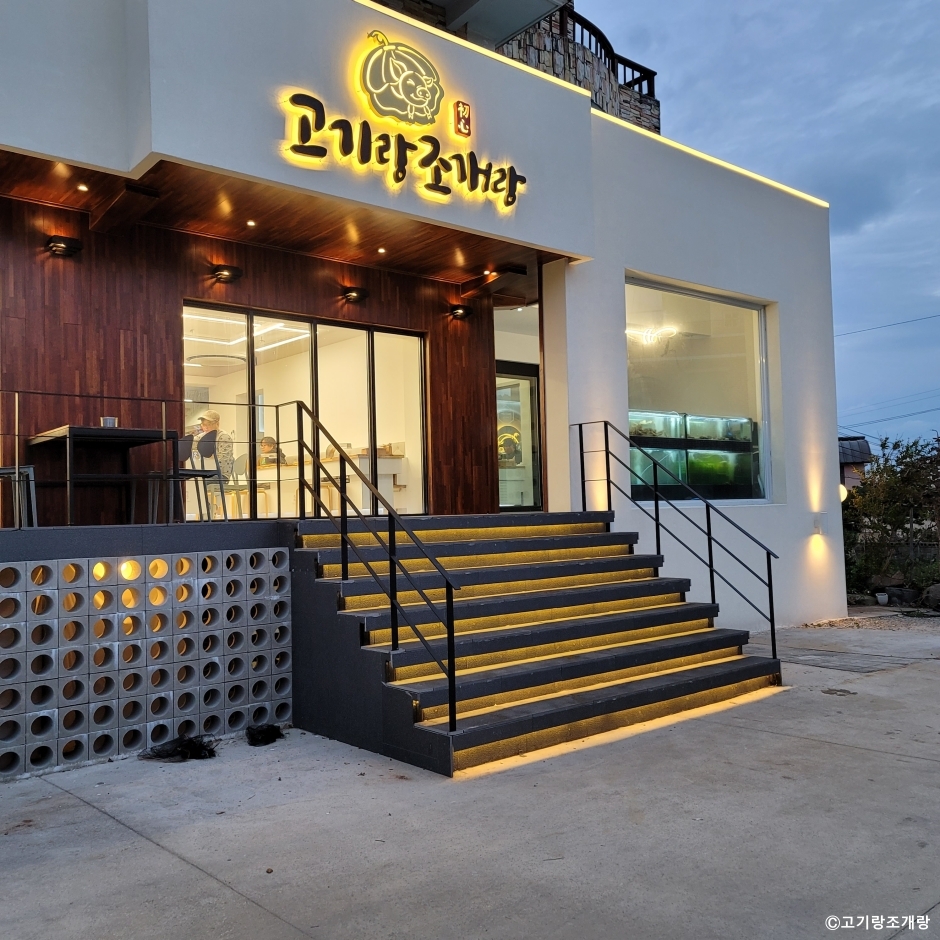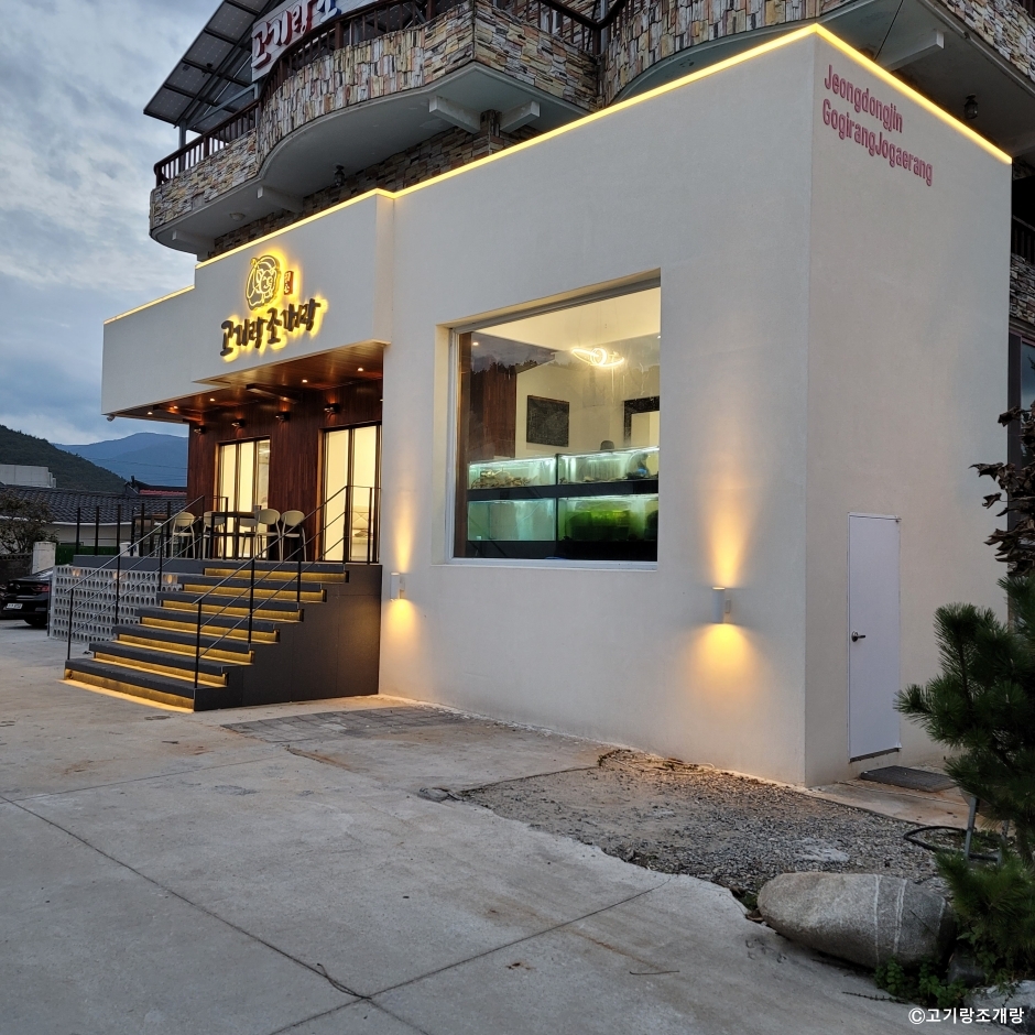 고기랑조개랑은 강릉시 정동진 모래시계공원 근처에 있는 맛집이다. 고기도 팔고 조개도 팔고, 대게도 파는 집이다. 이 모든 것을 모아서 한 번에 먹을 수 있는 세트 메뉴가 인기 메뉴이다. 한쪽에는 고기를 굽고, 한쪽에는 조개를 구워 가면서 먹을 수 있다. 마무리로는 해물라면을 시켜 먹으면 만족할 만한 한 상이다. 주차는 매장 앞에도 할 수 있고, 모래시계 공원의 무료 주차장을 이용할 수도 있다.